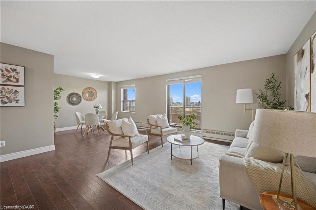 Suite 710 at 1100 Courtland Avenue East in Courtland Terrace located on the 7th floor. Stunning sunset views from this updated 2-bedroom corner unit with abundant natural light in living room and both bedrooms. Bright, updated kitchen and spacious living area. Carpet-free, move-in-ready condo with open concept layout with newly renovated kitchen and stylishly renovated bathroom. Generously sized balcony for morning coffee or your evening relaxation. Exclusive one parking spot located front row of back entrance of the building. Condo fees include heat, hydro, water, and building maintenance. This is a pet friendly building. Building amenities include elevator access, in-ground pool, sauna, play area, fitness center, party room and laundry facilities. Central location with easy access to public transit, LRT and shopping along Fairview Road South, grocery stores, schools, parks, and highways