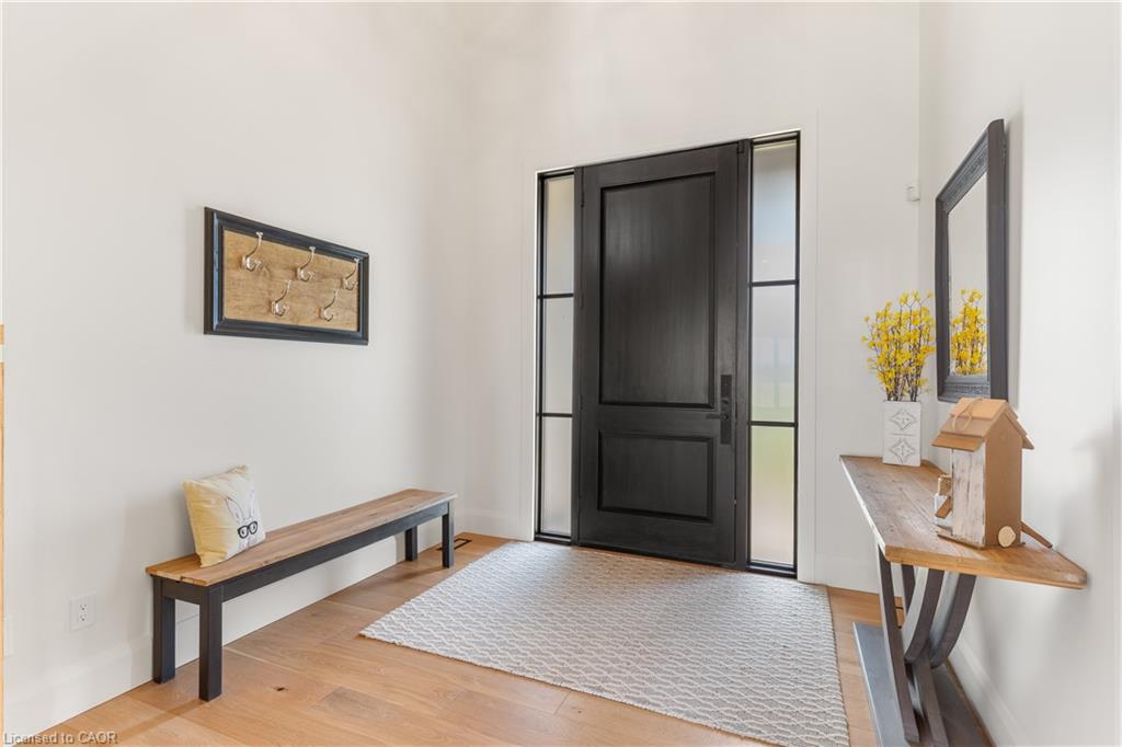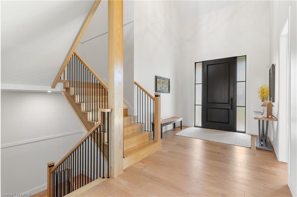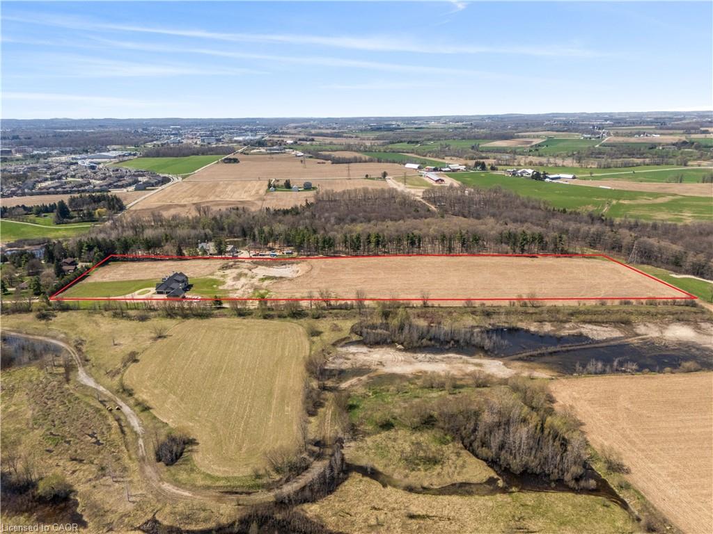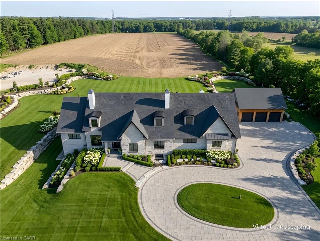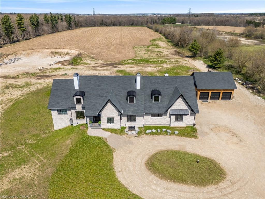 French Château–inspired country estate set on 22 private acres, offering nearly 8,400 sq. ft. of finished living space blending timeless craftsmanship with modern luxury. The residence features a hand-rocked stone exterior, steeply pitched rooflines, symmetrical façade, and soaring chimneys. A long private drive leads to a circular gravel courtyard, while oversized windows capture panoramic views from sunrise to sunset. Ideally located in a quiet Waterloo enclave, with the Grand River at one end and Canada’s tech hub at the other, this is a rare offering on prestigious Country Squire—known for estate living, acreage, and exceptional privacy. A custom 9-ft mahogany door opens to an interior defined by scale: 10-ft ceilings, wide-plank oak floors, vaulted tongue-and-groove ceilings, exposed Douglas Fir beams, and iron accents. The dining room is ideal for entertaining, filled with natural light. The gourmet kitchen features double islands, quartz counters, beverage fridge, and Thermador appliances including gas range, double ovens, and full-size fridge/freezer, plus pot filler and farmhouse sink. The home offers 5 bedrooms and 6 bathrooms, including 4 ensuites with heated floors. The main-floor primary suite features vaulted ceilings, fireplace, hidden sunroom, and a spa-like ensuite with walnut vanity, glass shower, and soaker tub. A loft leads to a private suite and lounge.