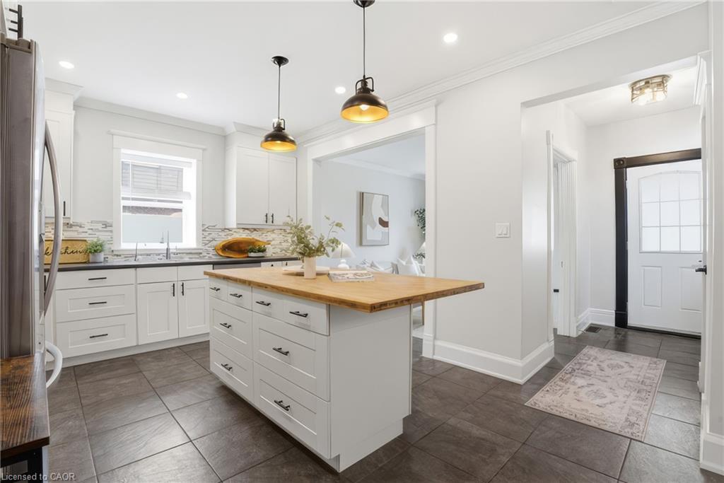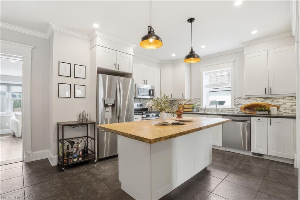 Step inside to a sun-filled home featuring high ceilings, abundant natural light, and stylish pot lights that enhance the open, airy feel throughout the main level. Thoughtful updates and finishes create a seamless flow between living spaces, making this home both inviting and functional. The kitchen is a standout, highlighted by a solid wood-top island and newer stainless-steel appliances including a fridge (2025), dishwasher (2025), and gas stove, along with a reverse osmosis system (2025) for added water quality. The spacious main floor family room is a thoughtfully designed addition, featuring a built-in gas fireplace that creates a warm and inviting atmosphere—perfect for relaxing or entertaining.