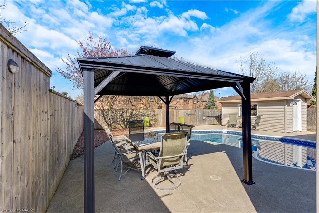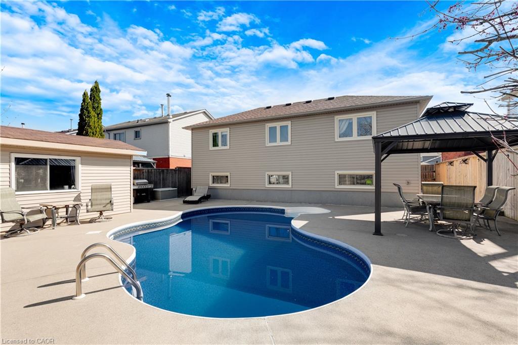 DOUBLE GARAGE, PRIVATE POOL & GREAT LOCATION! This meticulously maintained 4-level backsplit offers an expansive floor plan with over 2,300 square feet of finished living space, an ideal setting for growing families and those who love to entertain. From the moment you arrive and pull into the double-car garage, the pride of ownership is unmistakable. Step inside to bright, airy living spaces where a functional layout connects the formal living and dining areas to the heart of the home. The kitchen is a true standout, featuring warm cabinetry, a massive granite island, and sleek breakfast bar seating. With 3+1 spacious bedrooms and 2 full bathrooms, including a primary suite complete with a unique, modern glass-enclosed shower, a lower level family room and finished basement, there is plenty of room for everyone to find their own space to unwind. The true magic of this property, however, lies just beyond the sliding glass doors. Step outside into your own private resort, a backyard sanctuary designed for unforgettable summer memories. The heated salt-water inground pool takes center stage, surrounded by a spacious concrete patio ideal for lounging in the sun. Whether you're hosting weekend BBQs under the hard-top gazebo or tackling projects in the fully powered shed, this outdoor space offers both relaxation and functionality. Beyond the backyard retreat, you’ll find yourself perfectly situated close to schools, major highway access, and all the amenities Cambridge has to offer.