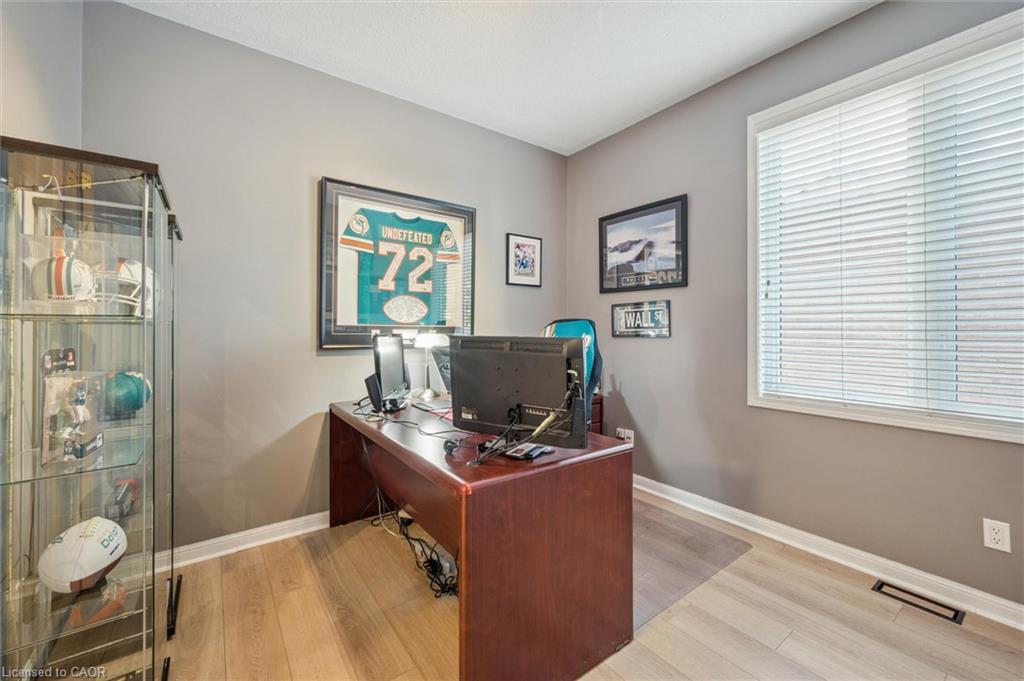 Welcome to 79 Zieman Crescent! This meticulously maintained 5-bedroom, 2.5-bathroom home with a total of 6 parking spots offersapproximately 4,000 sq ft of living space and is tucked away on a quiet street in a highly sought-after neighbourhood—perfect for a growingfamily. With a double car garage, main floor bedroom (currently used as an office), and abundant natural light, it’s just minutes from Highway401, making it ideal for commuters. The main floor with 9ft ceilings offers a bright, functional layout: formal living room, main floor bedroom (oroffice), 2-piece bath, and a separate coffered ceiling dining room with arches which flows into the open-concept kitchen and family room. Thespacious eat-in kitchen boasts a large island with breakfast bar, stainless steel appliances, under counter lighting, and ample cupboard space—conveniently located just off the garage entry. The adjoining family room features a cozy gas fireplace, lots of natural light and is perfect foreveryday living and entertaining. Upstairs, the primary suite is a true retreat with his-and-her walk-in closets, an electric fireplace, and aluxurious 5-piece ensuite with dual sinks, a 6-foot soaker tub, and a glass-enclosed shower. Three additional generously sized bedrooms, a fullbathroom, and an upper-level laundry room complete the second floor. The partially finished basement offers even more living space, currentlyset up as a large rec room with a bar/games/movie area, a home gym, and a large storage area that could be converted into bedrooms and abathroom (rough-in located near the furnace). Step outside to a fully fenced private backyard—ideal for entertaining, kids, and pets alike. Enjoythe well-maintained patio for summer BBQs or quiet evenings outdoors. Conveniently located near top-rated schools, parks, tennis, volleyball,forest trails, public & school bus routes, shopping, place of worship, and just minutes to the 401— a must see!