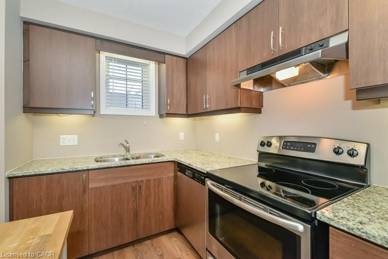 Bright spacious condo for rent! 10 minute drive to the Hwy 401. This 1 Bedroom, 1 Bathroom condo is carpet free. Built in 2015. The spacious open concept features a quality custom maple kitchen with Granite counter tops, kitchen island with breakfast bar, dining area and a large living room. Walk through to the full bath with ceramic tiles and soaker tub, with acrylic surround, in-suite laundry and large Master Bedroom with wall to wall closet. This unit is spotless, well maintained, laminate flooring for easy maintenance. The apartment is equipped with all appliance including Stainless Steel Stove, Dishwasher and Fridge. Stacked Washer & Dryer, Central Air, Water Softener and Air Exchanger. And there is more, this condo comes with a Private 9 x 12 patio with lockable gate where you can BBQ, set up a patio set & store your bike. Parking is right outside the unit at the front door Parking # 25. Visitor parking also available close by. Window coverings include Foxwood Blinds. Condo Fee included in rent. Tenant pays all utilities and hot water heater rental. A Must See! Book your appointment today. Available for immediate occupancy!
