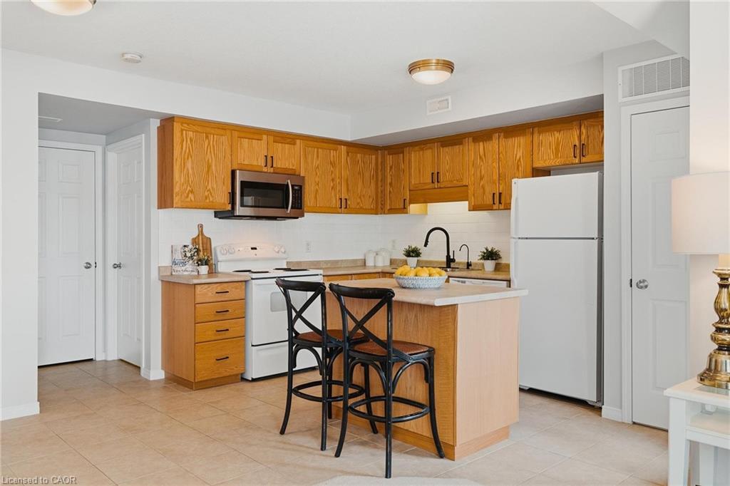 The kitchen features an island that is perfect for meal prep or dining and a walkout to your private balcony, making it easy to enjoy fresh air, coffee breaks, or summer dinners just outside your door.