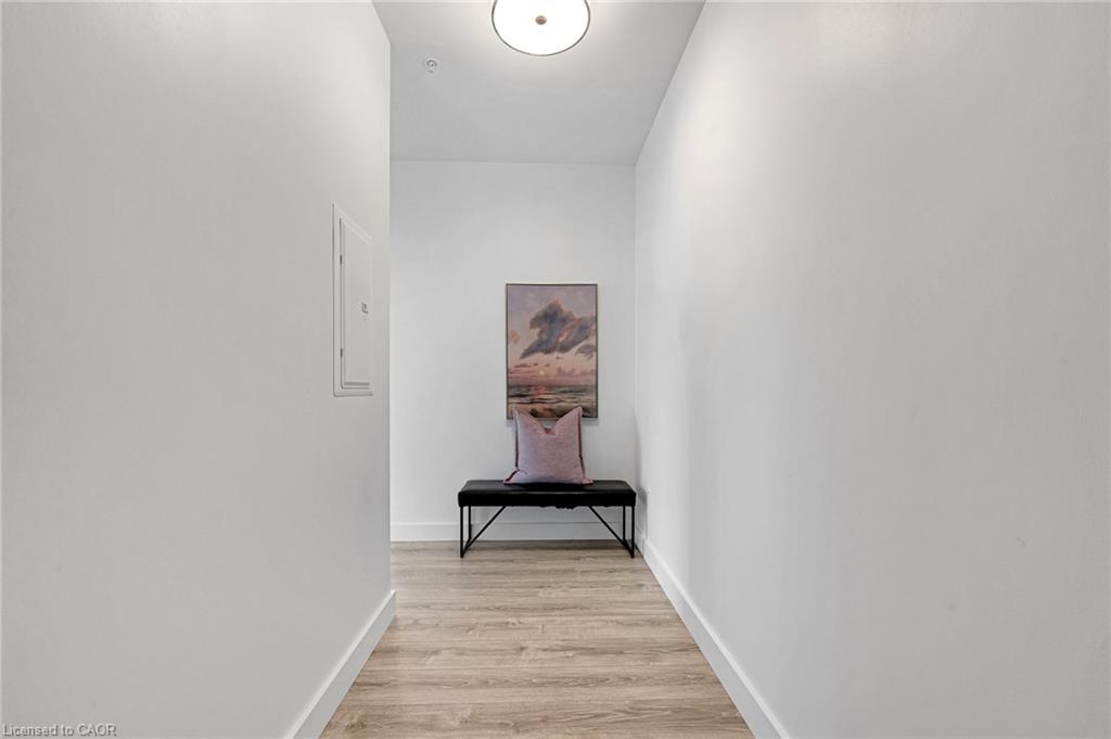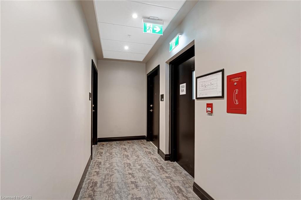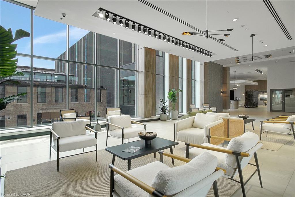 Rare Two-Bedroom Corner Unit with TWO Parking Spaces in the Coveted Gaslight District! Nestled in the heart of historic downtown Galt, this elegant two-bedroom, two-bathroom corner condo offers a perfect blend of style, comfort, and urban convenience. The highly sought-after Gaslight District combines residential, commercial, and cultural elements to create a vibrant and dynamic living experience. Step inside to find nine-foot painted ceilings, wide plank flooring, and premium finishes throughout. The modern kitchen is designed for both function and aesthetics, featuring sleek cabinetry, quartz countertops, a tile backsplash, an oversized island with an undermount sink and gooseneck faucet, and top-tier stainless steel appliances. The open-concept layout seamlessly connects the kitchen to the spacious living and dining areas, making it ideal for entertaining. Floor-to-ceiling windows and a generous balcony invite an abundance of natural light into the space. The primary suite is a private retreat, offering ample closet space, balcony access through sliding glass doors, and a spa-like four-piece ensuite with dual sinks and a walk-in shower. A second bedroom with expansive windows, a four-piece bath with a tub and shower combo, and in-suite laundry complete this impressive unit. Residents of Gaslight enjoy an array of premium amenities, including a stylish lobby with ample seating, secure video-monitored entry, a state-of-the-art fitness center with yoga and Pilates studios, and a game room with billiards, ping-pong, and a large TV. Additional features include a catering kitchen, a private dining room, a cozy reading area with a library, and an expansive outdoor terrace with seating areas, pergolas, fire pits, and a barbecue zone. Experience the best of modern living in one of Cambridge's most exciting communities!
