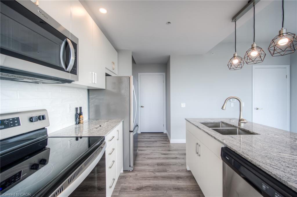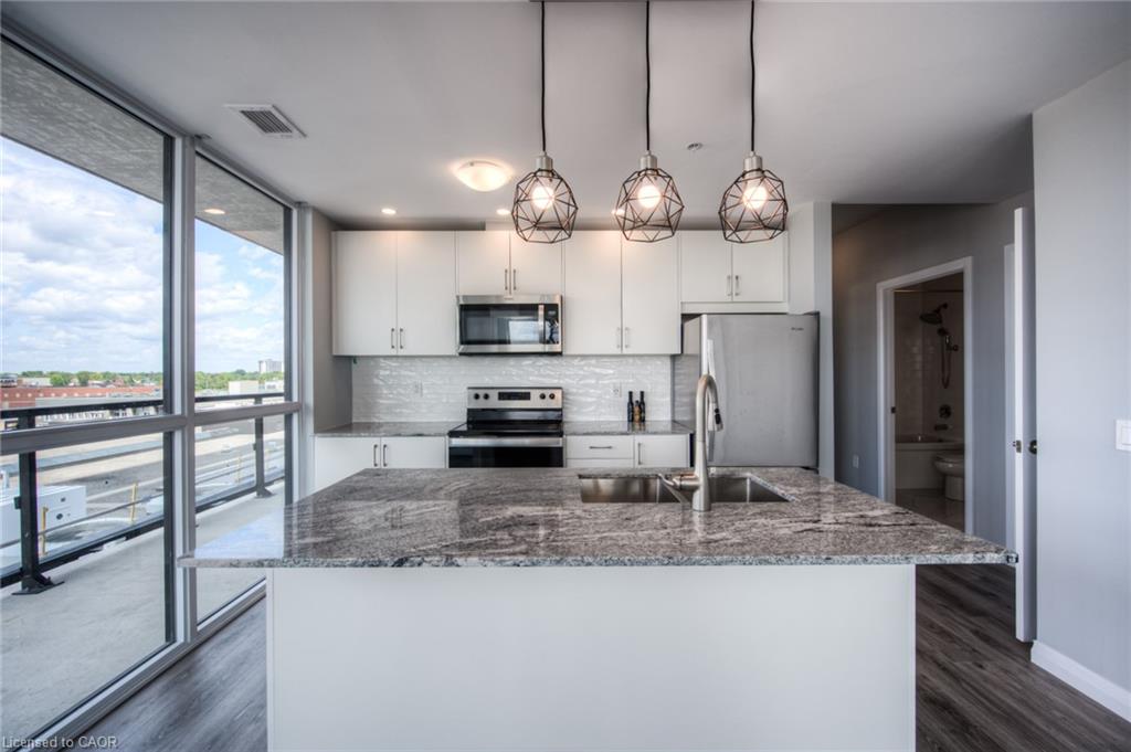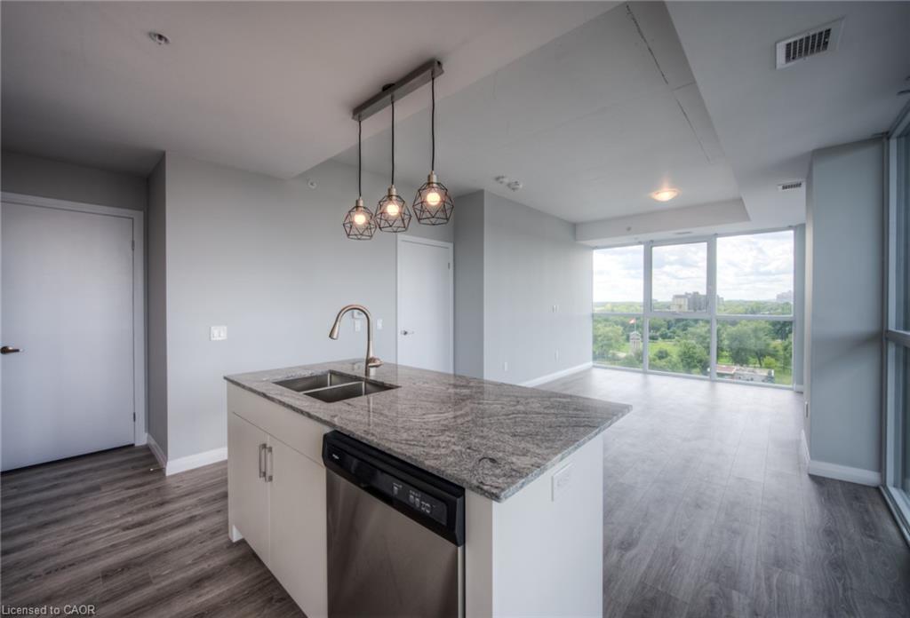 LIVE IN THE SOUGHT-AFTER CHARLIE WEST BUILDING IN DOWNTOWN KITCHENER! Rent includes heat, A/C, water, and high-speed internet...plus 1 underground parking spot and 1 locker. This corner-unit condo has 2-bedrooms (separated in the unit) + office space/den. At approx. 1,200 sq ft (incl. balcony), this south-west facing condo is open concept with wrap-around floor-to-ceiling windows. It has a very large balcony, accessible from both the living area and the 2nd bedroom. Beautiful views! Convenient in-suite laundry with full size washer & dryer. Primary bedroom has walk-in closet and ensuite. Both bathrooms in the condo are 4-piece. Amenities include fitness facility, yoga/wellness studio, outdoor terrace with BBQs, guest suites, social lounge - to name a few! Electric vehicle charging stations available ($). Walking distance to shops, restaurants, and Victoria Park. Condo fronts onto ION light rail transit. Close to Google and Kitchener's Innovation District. Book your private viewing today!