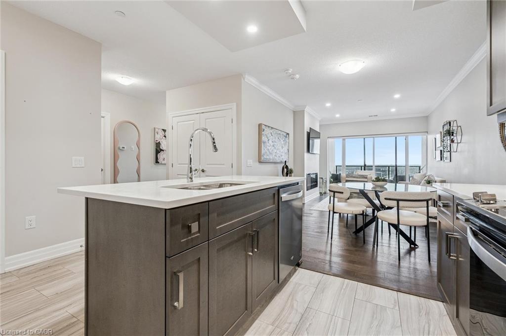 Welcome to this stunning 2 Bedroom + Den, 2-bathroom condo at 1880 Gordon Street, a bright and beautifully designed suite in Guelph's sought-after Gordon Square community. This sophisticated unit features an open-concept layout with a generous living and dining area, a modern kitchen with quartz countertops, a large island and stylish cabinetry, and floor-to-ceiling windows that flood the space with natural light while showcasing tranquil views of green space and the city. The primary bedroom retreat offers a walk-in closet and private 3-piece ensuite, while the second bedroom, versatile den and additional 4-piece bathroom provide flexibility for family or guests. The den is ideal for added living space, storage or a home office. Enjoy a spacious in-suite laundry room with ample storage, along with a private balcony perfect for morning coffee or evening sunsets. Residents have access to premium amenities including a fitness centre, golf simulator, games and party room, guest suite, and more. This unit also includes one underground parking space and an owned locker. Perfectly located in Guelph's vibrant south end close to shopping, restaurants, entertainment and commuter routes, Unit 809 delivers comfort, style and convenience. Book your private showing today!