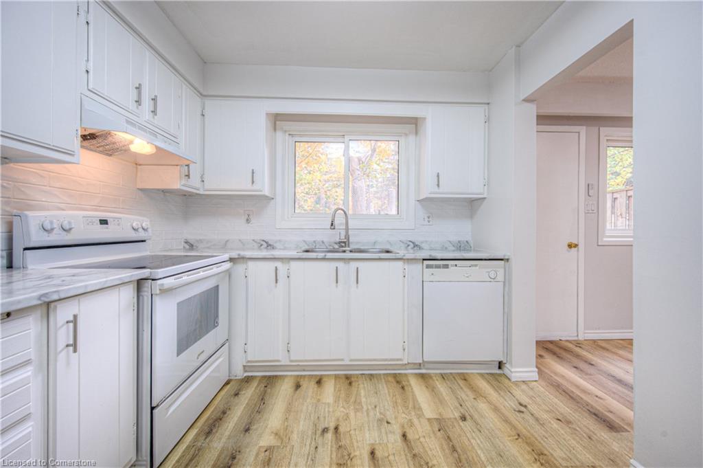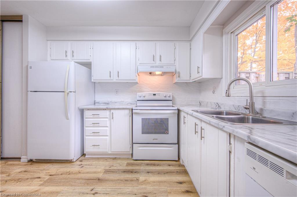 Welcome to 9-206 Green Valley Drive! This is beautiful 3-bedroom 2-bathroom home is perfect for first time home buyers or investors! This freshly painted (2024) MOVE in READY home provides tons of living space, storage and a fully fenced backyard. As you enter the main floor you will be greeted by a spacious living room with a large window providing ample natural light. You will also find a good-sized dining room with direct access to the fully fenced backyard. The kitchen is bright and has lots of storage space with new countertops, sink, backsplash and faucet (2024). The main floor and basement have been beautifully upgraded with new LVP flooring (2024) throughout. On the upper level, you will find a large Primary Bedroom with a walk-in-closet and 2 very spacious bedrooms with oversized closets. The upper level has newer laminate flooring (2021) and a stunning newly renovated 4-piece bathroom (2024). The finished basement also has a newly renovated charming 2-piece bathroom (2024), a laundry room with extra storage space and a 4th bedroom! This home is also close to shopping plazas, schools, Conestoga College, 401 and so much more. Be sure to book your showing today!