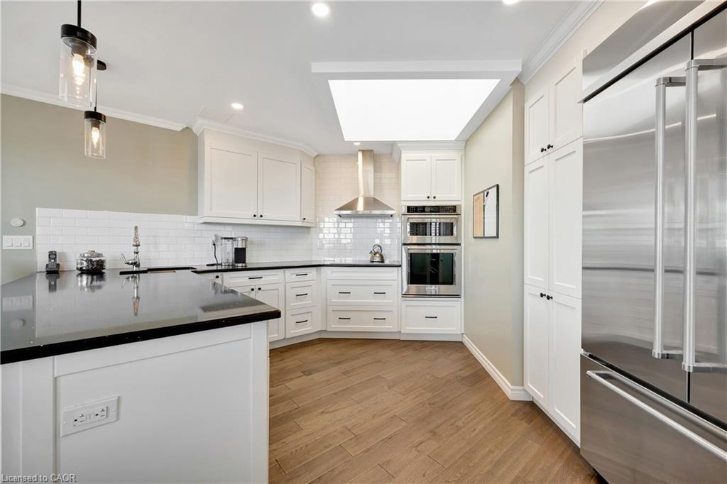 Incredible opportunity to own this luxurious corner penthouse! Fully and completely renovated, featuring two bedrooms, two full bathrooms, two parking spots owned with one underground and one surface parking! Extremely bright unit with two skylights and windows wrapped around entire unit. Large balcony with two walkouts - one off living room and one off primary suite, overlooking historical Queen Street and across the street from Centre in the Square performing arts venue! Beautiful architectural, prominence, and daily cultural life, symphony, performances, theater and community arts events. A short walk to the Kitchener public library, downtown restaurants, Kitchener market and GO/LRT. This unit features hardwood walnut flooring through, stunning gourmet kitchen with large island and sleek black quartz counters, tile, backsplash, built-in appliances, 2 walk-in showers, in-suite laundry, large storage locker owned with Unit, all equipment owned - furnace and air conditioner new 2024, hot water heater new 2025, water softener new 2018. Water is included in the condo fee. Lots of visitor parking for overnight guest. This is one of a kind, highly sought after rarely found corner penthouse suite! Amenities include exercise room, sauna, games and party room.
