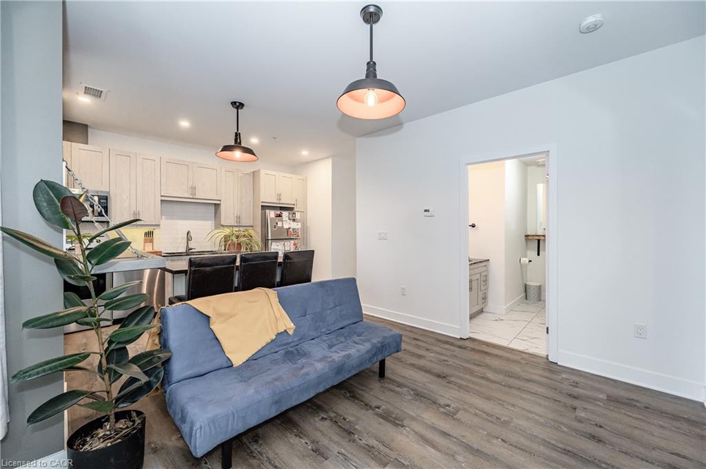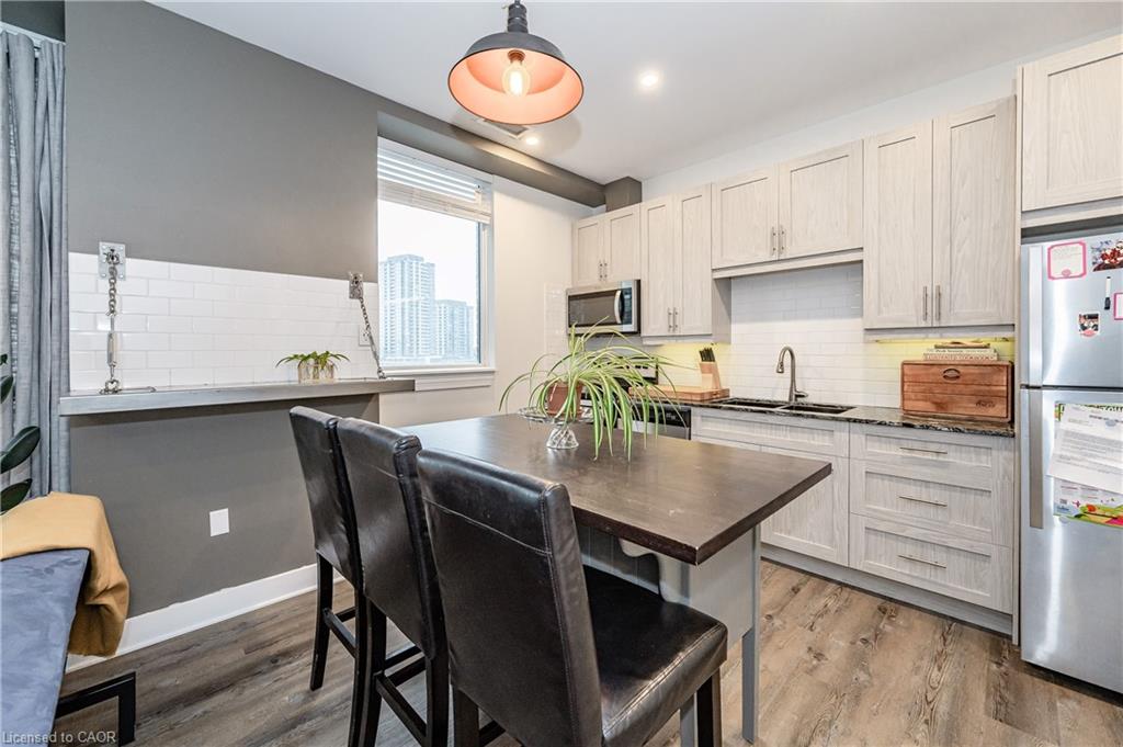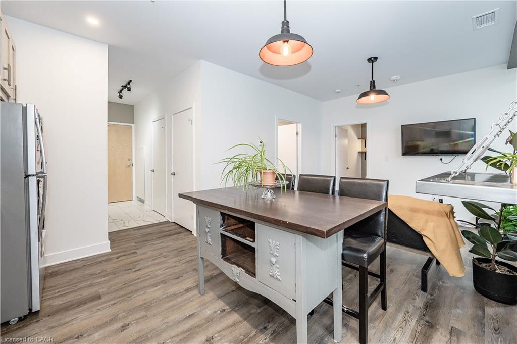 Fantastic opportunity to own this modern 1 bed, 1 bath unit in the highly sought after Garment Street Lofts in prime DTK location! This 625 sf unit features 1 underground parking space, bright and spacious open concept layout, generous eat-in kitchen space, living room with walkout to balcony overlooking the rooftop patio and extra space for storage room or small office area. Several custom upgrades have been completed including modern lighting, breakfast bar, custom reclaimed wood/steel shelving, subway tile back splash and new flooring, stainless steel appliances, quartz countertops, modern cabinetry, and more. AAA location just steps to parks, LRT, restaurants, shopping and all that Downtown Kitchener has to offer. Available for immediate possession.