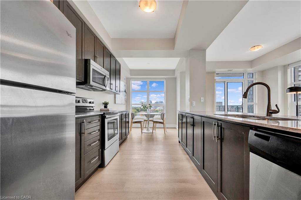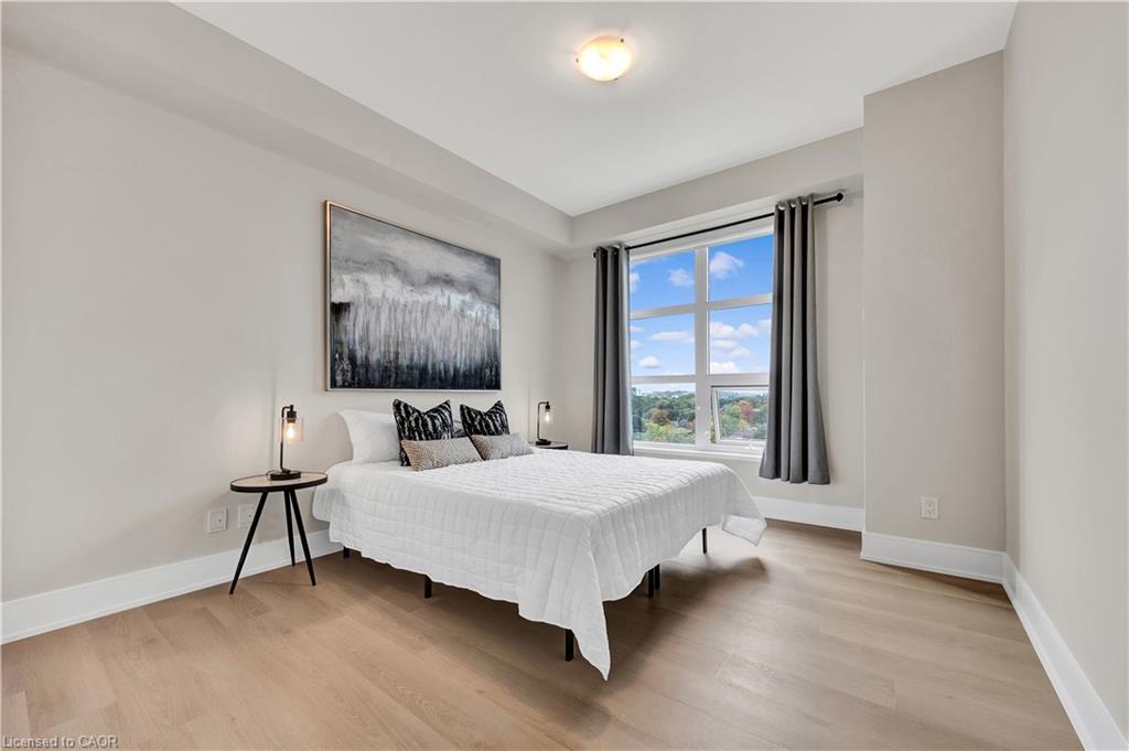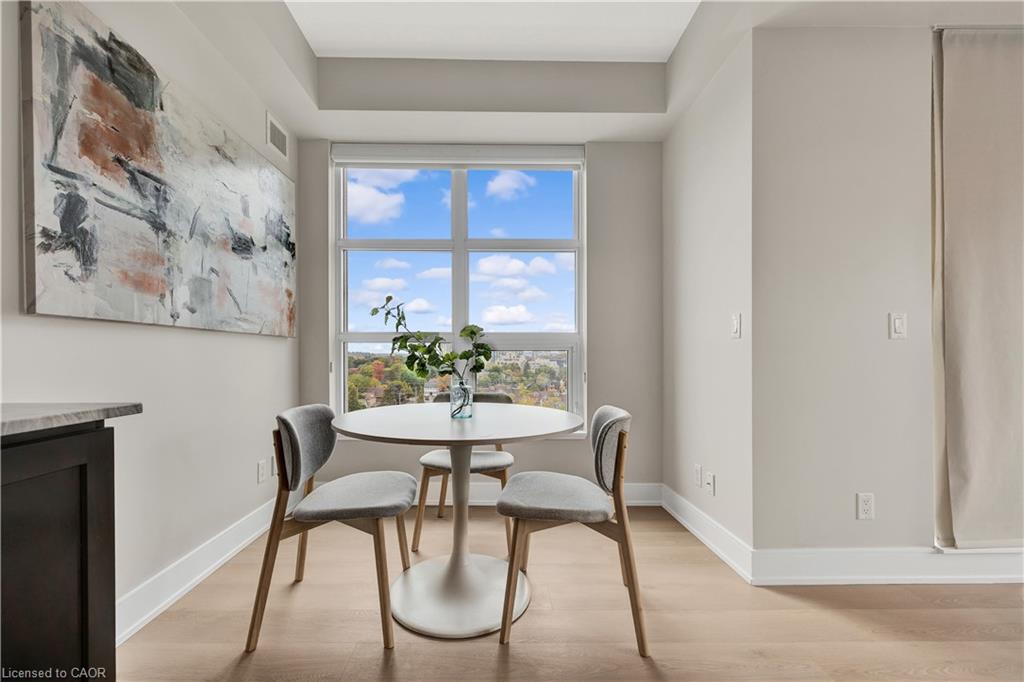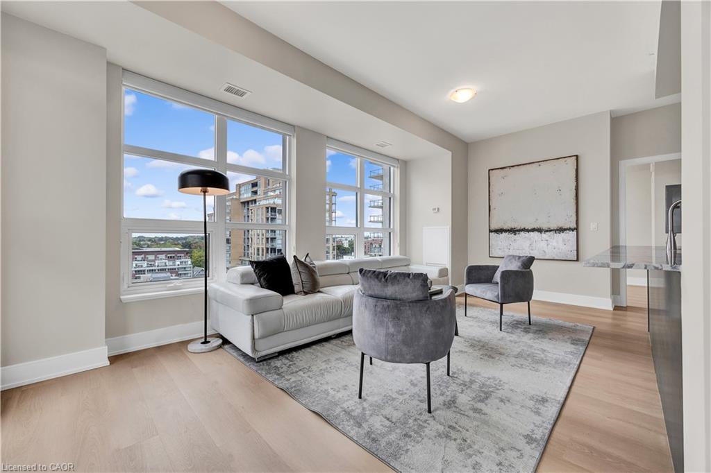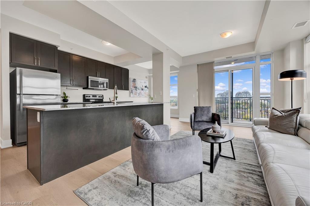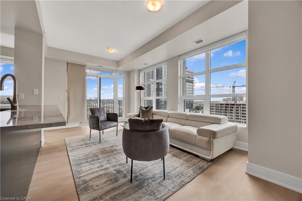 Welcome to Unit 908 at 144 Park St, Uptown Waterloo! This bright corner 2-bedroom, 2-bathroom condo offers over 1,000 sq. ft. of modern living space with a fantastic layout. Featuring brand new flooring that enhances the natural light throughout, this unit boasts floor-to-ceiling windows with sweeping views of Uptown Waterloo and Waterloo Park. The spacious primary suite includes a private ensuite bathroom, while the second bathroom is a convenient 3-piece for guests or family. Your underground parking spot comes equipped with an EV charging outlet, and a storage locker is also included. Residents of 144 Park enjoy impressive amenities including a full-size gym, movie theatre, party room, and more. The building is also uniquely connected to 155 Caroline on the 4th floor, where residents can access a shared outdoor terrace perfect for relaxing or entertaining. Steps from shopping, dining, LRT, and all that Uptown Waterloo has to offer, this condo combines comfort, convenience, and lifestyle.