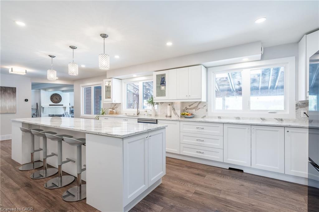 Welcome to your dream home in the heart of Cambridge, offering stunning views of the Grand River and the Galt Country Club. This beautifully updated family residence is set on a private lot with no rear neighbours, featuring a heated pool, hot tub, and a covered deck with a TV—perfect for relaxing or entertaining year-round. Inside, you’ll find a spacious 3-bedroom layout with a bonus office above the garage—ideal for working from home. The primary suite is a true retreat with a newly renovated ensuite featuring a freestanding tub, dual vanity, and an expansive glass shower. The main floor boasts a completely renovated kitchen with soft-close cabinetry, under cabinet lighting, an oversized island, built-in Samsung appliances, and a convenient pot filler above the stove. Additional features include main floor laundry, a cozy family room with a wood- burning fireplace, and a fully finished lower level with a 4th bedroom, full bath, and plenty of space for recreation. Recent upgrades include new garage doors, all new windows, eavestroughs, fascia, downspouts, modern interior doors, trim and baseboards (2023), and new furnace, water