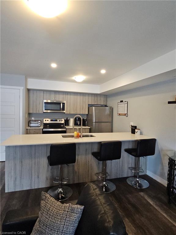 Welcome to this beautiful Unit A1 at 1331 Countrystone Drive, Kitchener! This bright, spacious home is designed for comfort and style, featuring a good size living room for entertaining and everyday use, A dining area and a large kitchen peninsula with a double sink. Carpet free flooring flows through the kitchen, living, and dining areas, for easy maintenance. The unit offers two bedrooms, including a primary suite with double closets and a private 3-piece ensuite. Both bedrooms are carpeted and feature large windows that invite natural light. The main bathroom is a contemporary 4-piece with a relaxing soaker tub. Additional conveniences include in-unit laundry, a storage closet, and a designated parking space. The large sliding door opens to the front steps, making access easy and convenient! Perfect for low-maintenance living, this home combines style and functionality!