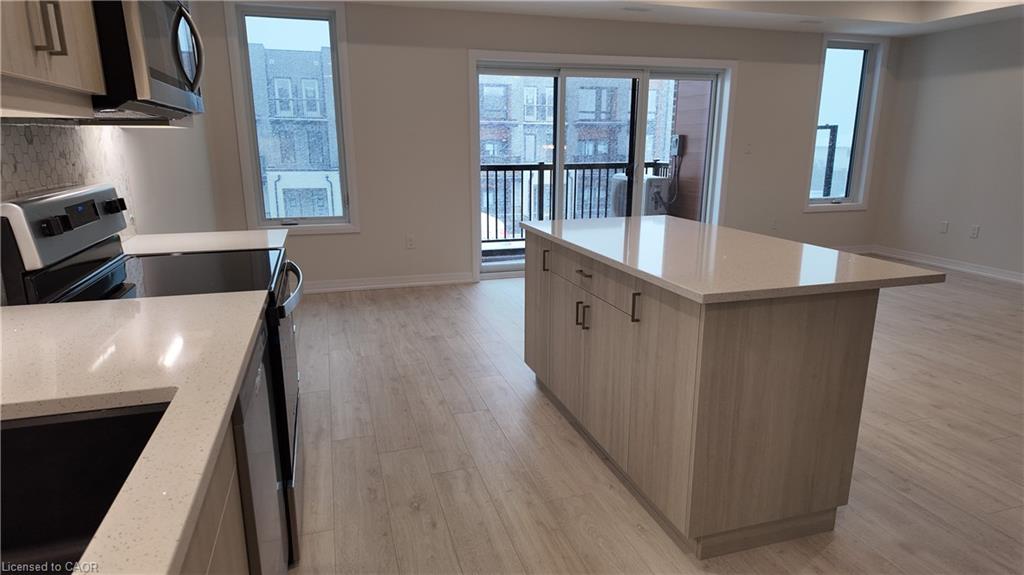 The main living space is bright and open, centered around a stylish kitchen with stainless steel appliances, a large island with breakfast bar seating, and ample cabinetry. The entire unit is carpet-free, creating a fresh, contemporary feel throughout. Step out onto your private balcony, perfect for a morning coffee or evening unwind.