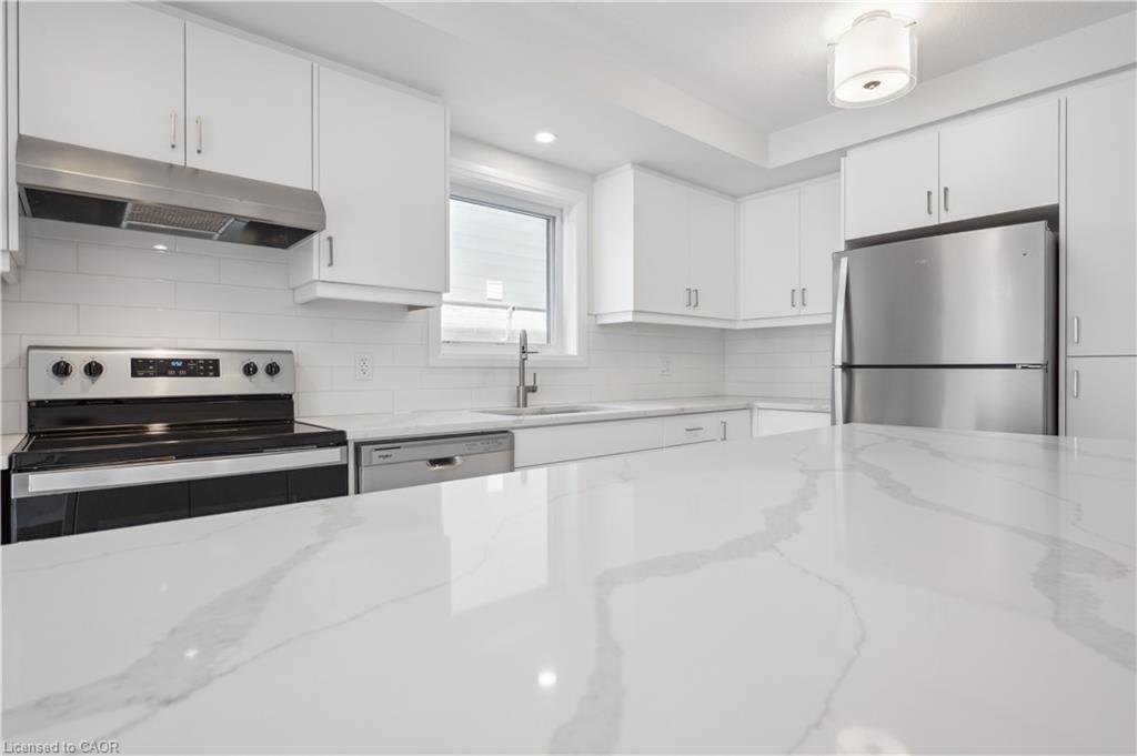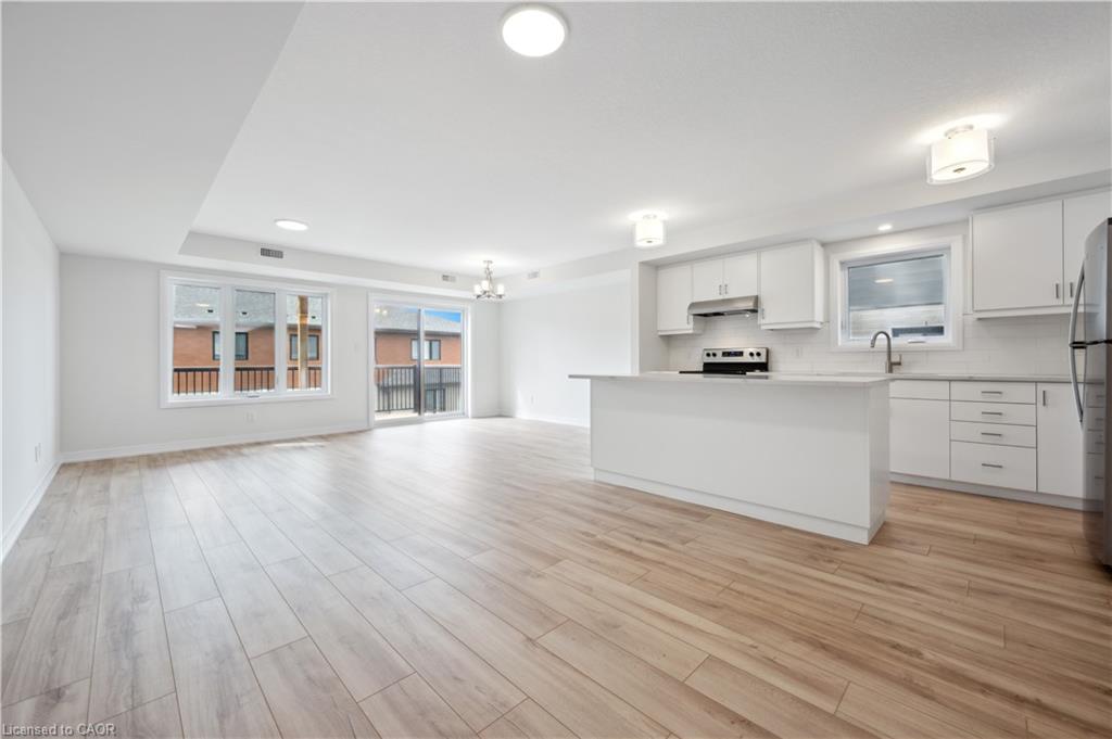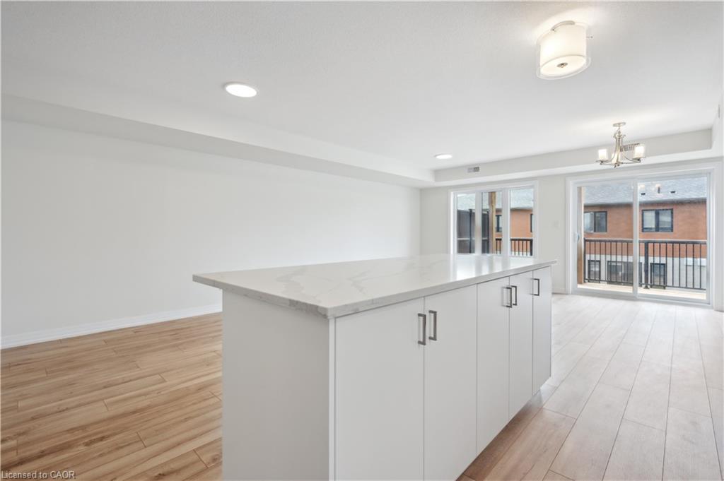 Brand new, ready now, and available for a quick closing, this gorgeous 3 bedroom, 2.5 bath condo townhouse is located in sought-after Harvest Park in Doon South. The kitchen is sure to impress with plenty of cabinetry, a large island, quartz countertops, and stainless appliances. The great room is of very generous proportions and sliders from the dining area lead to a spacious deck. On the way to the upper level, you'll love the bonus lounge that is the perfect spot for a family room or home office. Upstairs are 3 bedrooms plus a laundry room. The primary suite features a second, private balcony , a 3 piece bath and lots of closet space. A main 4 piece bath completes this level. One surface parking space. Condo fees include building and grounds maintenance as well as High Speed Internet. This is an excellent location - near Hwy 401 access, Conestoga College and beautiful walking trails. SALES CENTRE LOCATED at 158 Shaded Cr Dr in Kitchener - open Monday to Wednesday, 4-7 pm and Saturday, Sunday 1-5 pm .