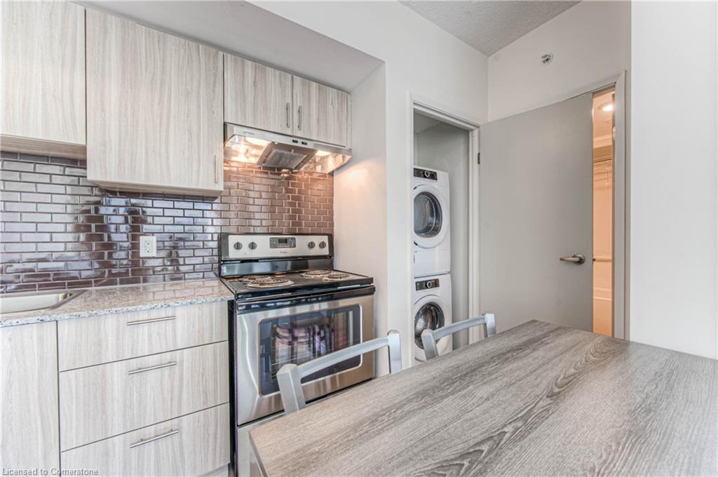 The suite includes a five-piece appliance package and in-suite laundry with a stackable washer and dryer. Oversized low-E argon windows provide ample natural light, and knock-down texture ceilings add a modern touch. Climate control is fully individualized, allowing you to set your own heating and cooling preferences. The unit is also pre-wired for high-speed internet, cable, and telephone.